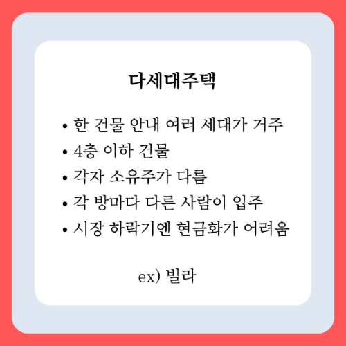 다세대주택은 요즘같이 전세 사기가 유행하는 시기에 각 세대별 소유주가 달라서 전입신고 시 정확하게 주소와 호수를 써야 주택임대차보호법 적용 대상이 되니 꼭 알고 있어야 하는 부분입니다. 또한 다세대주택은 각 호수마다 개별적으로 매매가 가능한 장점이 있지만, 만약 모든 호실을 1명이 소유하고 있을 경우 다가구 주택처럼 1주택자로 보는 것이 아니라 다주택자로 분류된다는 점고 알고 있어야 합니다.