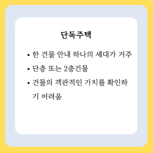 단독주택은 보유하고 있는 대지가 집마다 모두 다르고 주택이 있는 토지 역시 용도지역이 제각각이어서 설계, 디자인, 자재 등이 건축주의 취향대로 지어지다 보니 건물의 객관적인 가치를 확인하기가 어렵습니다. 하지만 공동 주택이 대지를 각 세대가 지분의 형태로 소유하고 있다면, 단독주택은 대지 모두가 단독 소유기 때문에, 향후 자유롭게 토지를 이용할 수 있다는 유리한 부분도 있습니다. 또한 재개발 지역이면 감정평가를 잘 받을 수 있다는 장점이 있습니다.
