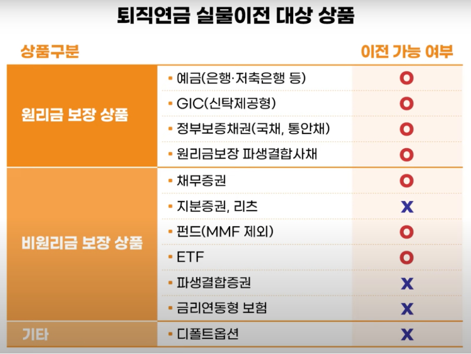 - 셋째, RP, MMF, 사모펀드, 금리연동형 보험 같은 금융상품은 현물이전에서 제외되니 이 부분도 확인해야 합니다.