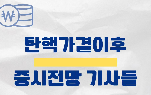지난 토요일 탄핵표결이 가결되었습니다. 파면 선고까지 헌법재판소에서 파면이라는 판결이 나오기까지 큰 산이 남아 있지만 불안요소가 조금은 감소되어 금융시장도 조금씩 나아질꺼 같다라는 전망을 하는 기사들이 있어서 몇가지만 짧게 공유해보려 합니다.