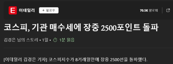 <이데일리 - 코스피, 기관 매수세에 장중 2500포인트 돌파>