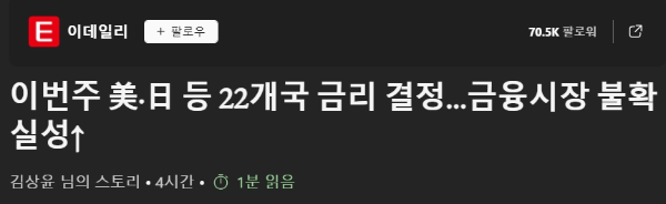 <이데일리 - 이번주 미일 등 22개국 금리 결정 금융시장 불확실성↑>