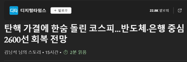<디지털타임스 - 탄핵 가결에 한숨 돌린 코스피, 반도체, 은행 중심 2600선 회복 전망>